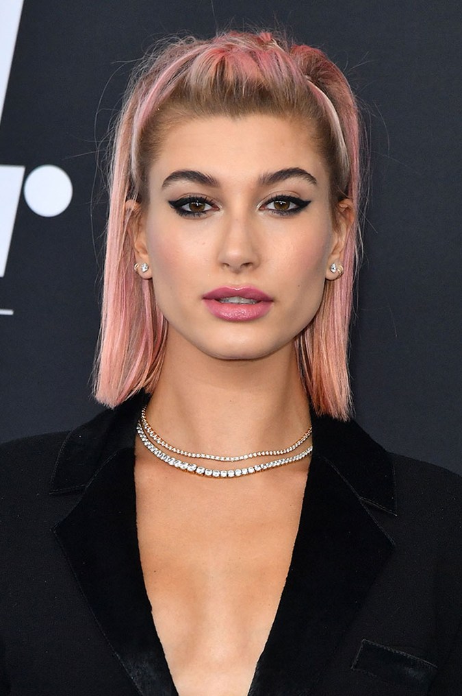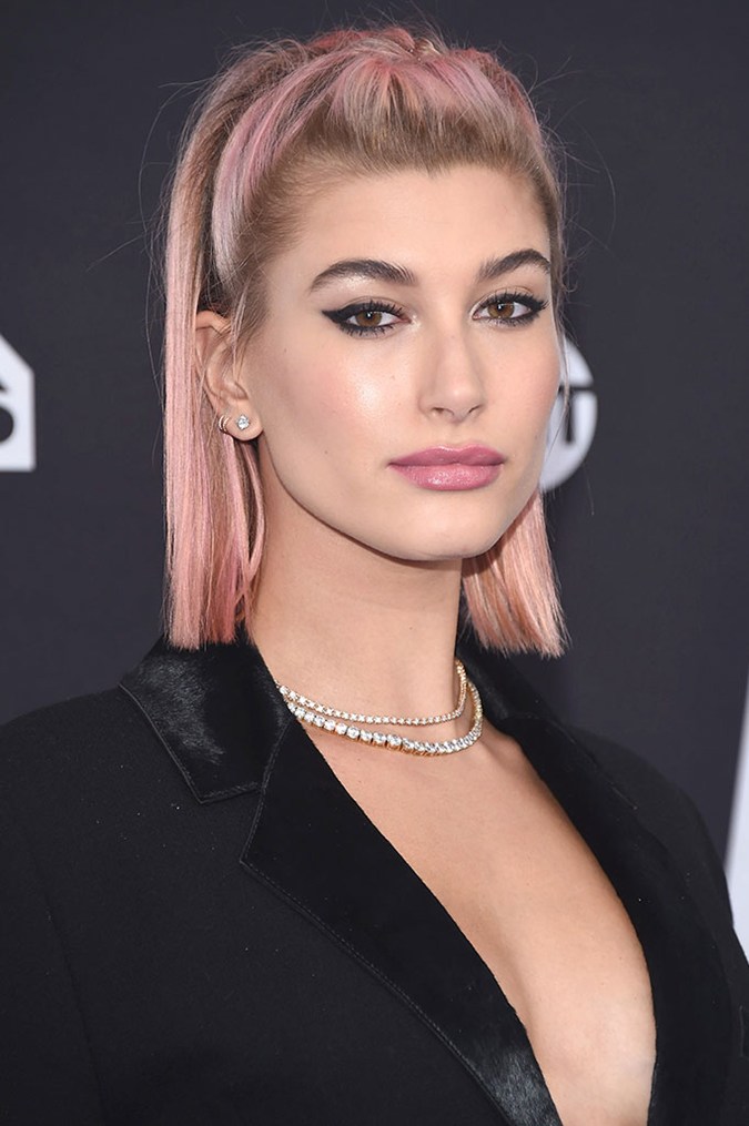 Hailey steps up the off-duty hair look and makes the case for the half-up braided style. While this one might look a little more intricate, it’s actually quite simple. Her half-up section has been styled into a tight French braid (check out how to master this braid here), while the rest of her hair has been left down. The pink pastel hue? Optional!