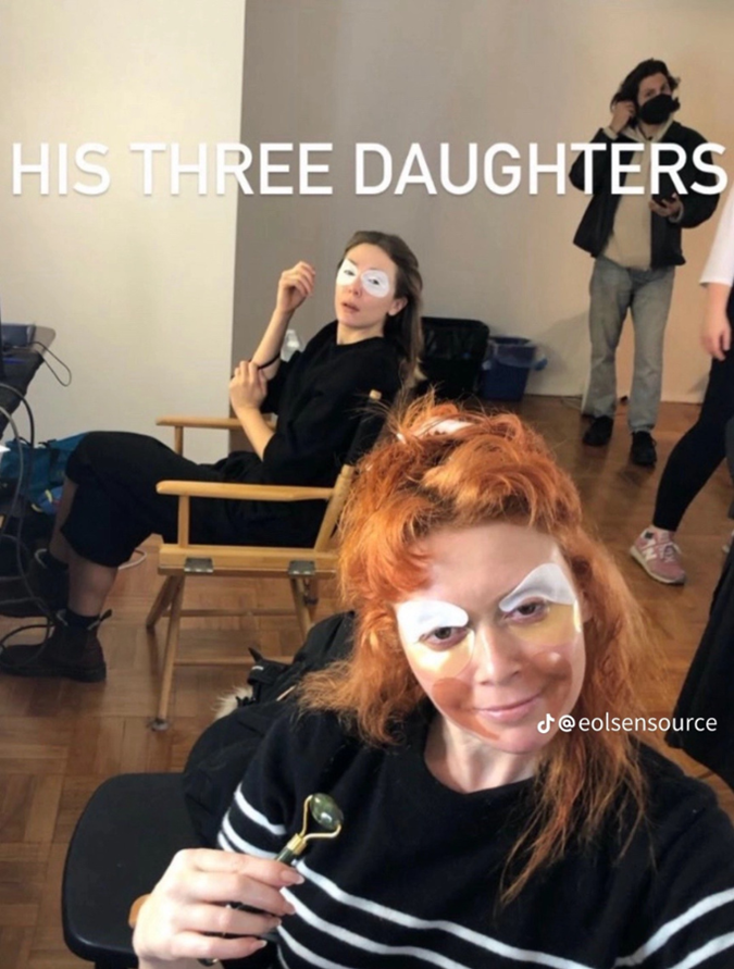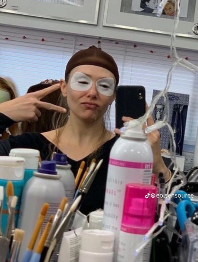 Case in point? Whilst working on His Three Daughters, Olsen combatted the effects of an early call time with a few sets of eye patches strategically placed underneath her eyes and on her upper eyelid. We're talking a 360 degree approach to tired eyes, dark circles and puffiness, people. Olsen calls them her "double trouble eye masks" — it's genius.