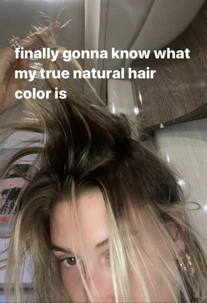 The model shared the revealing image of herself via Instagram stories, pulling her hair from the roots, to highlight the contrast in colour for all eyes to see. “Finally gonna know what my true natural hair colour is,” she wrote.