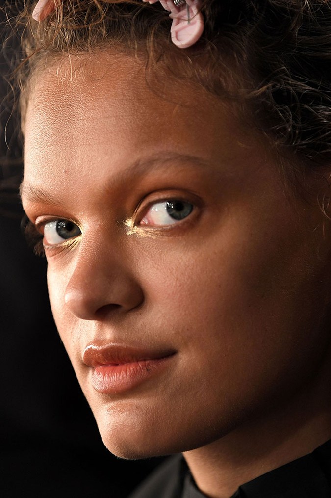 To achieve the hint of gold on the inner corners of the eye, Mackie used a gold pigment and combined it with a water-based mixing medium, like MAC Cosmetics Mixing Medium Eyeliner, which was applied throughout the inner corner of the eyes. “Then we’ve come back in with a cotton bud and used the tip to give it more movement, so it’s not just placed on,” adds Mackie.