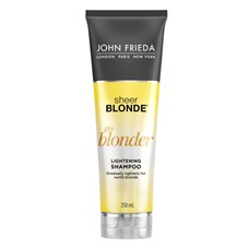 John Frieda Sheer Blonde® Go Blonder Lightening Shampoo gradually lightens blonde tones for brighter shades of blonde with a lightening complex and chamomile. The formula also contains lactic acid, which breaks down colour pigments inside the hair shaft and improves the condition of hair by tightening the cuticle and strengthening the hair shaft. The shampoo and conditioner should only be used until desired shade is reached.