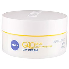 NIVEA Q10 Plus Anti-Wrinkle Day Cream is an anti-ageing day cream that visibly reduces wrinkles and prevents new ones for younger looking skin. The formula increases the natural Q10 and creatine levels in skin to fight wrinkles from within and visibly smooth the skin. Contains SPF 30 and UVA protection to prevent external influences from creating new wrinkles.
