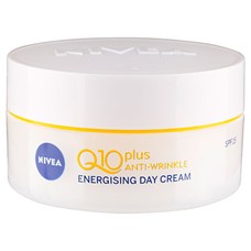 NIVEA Q10 Plus Anti-Wrinkle Energy Day Cream is an anti-ageing day cream for all skin types. With regular use, the cream supports the skin's own Q10 and creatine, helping give skin energy to fight free radicals and visibly reduce the appearance of fine lines and wrinkles. The revitalising benefits of goji berries immediately awaken tired, dull skin for fresh and glowing complexion. SPF 15 and UVA sun protection help prevent the formation of new wrinkles.